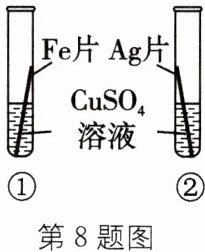 8. (2023·郴州)为验证铁、铜、银三种金属的活动性顺序,小东设计了如图所示的两组实验。下列说法正确的是( )