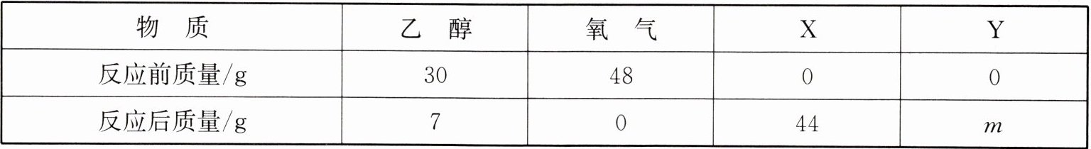 (3) 在密闭容器中,将乙醇$(C_2H_5OH)$放入氧气中燃烧,若生成物均为化合物,测得反应前后物质的质量如下表,根据表中数据,可确定未知物 Y 反应后的质量 m 为______。
