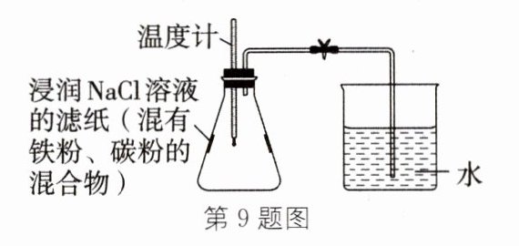 9. 利用铁粉、碳粉、氯化钠进行铁的锈蚀实验(装置如图所示,装置气密性良好)。实验 1 min 后温度计读数上升,8 min 后打开止水夹,水倒吸入锥形瓶。实验数据如表: