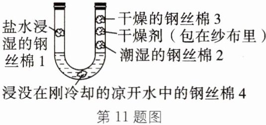 11. 如图所示是小明借助 U 形管探究钢铁锈蚀条件的装置图。过一段时间后观察,发现钢丝棉 1 和钢丝棉 2 表面都出现不同程度的红褐色锈斑。手摸钢丝棉 1、2 周围的玻璃管外壁,感觉比其他地方温度略高。24 h 后,钢丝棉 3、4 表面仍然没有明显变化。下列说法错误的是( )