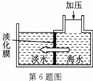 6. 如图,对淡化膜右侧的海水加 $ 60 $ 倍大气压,水分子可以透过淡化膜进入左侧淡水池,而海水中的其他成分不能通过淡化膜,从而得到淡水。下列对加压后右侧海水成分变化的分析正确的是 ( )