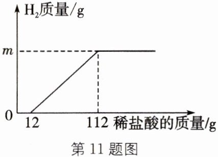 11. (2023·眉山)将一块已生锈的铁片放入质量分数为 7.3%的稀盐酸中充分反应,测得生成 $ H_2 $ 的质量与稀盐酸的质量关系如图所示(假设铁片除有 $ Fe_2O_3 $ 外不含其他杂质)。下列说法错误的是( )