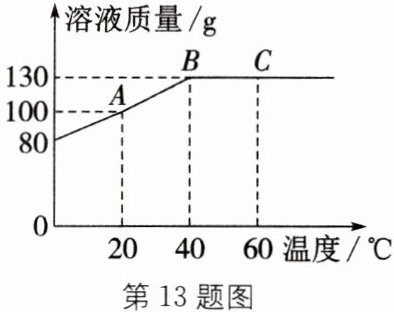 13. 将 80 g $ M $ 物质加入 50 g 水中,充分溶解,测得溶液的质量随温度的变化曲线如图所示,按要求填空。