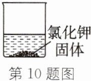10. (2023·杭州)已知氯化钾的溶解度随温度升高而增大。向盛有$40g氯化钾的烧杯中加入100g$水,充分搅拌溶解后现象如图所示。此时溶液温度为$20^{\circ}C$,下列说法正确的是( )