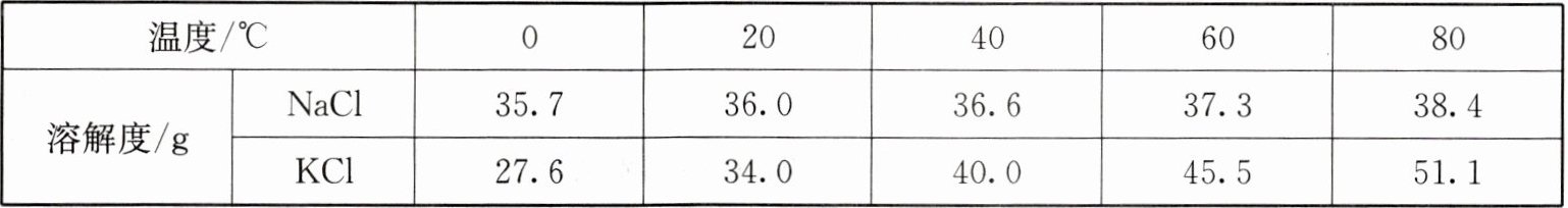 | KCl溶解度/g | 27.6 | 34.0 | 40.0 | 45.5 | 51.1 |