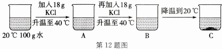 ③ 某同学进行如图所示实验,得到$A$、$B$、$C$三种溶液,$C中析出KCl$固体的质量为______g。