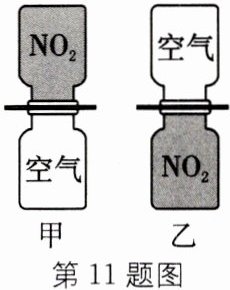 11. 为验证分子的特点,小华按如图所示的两个装置进行实验,分别取一瓶红棕色$NO_2$气体和一瓶无色的空气口对口放置,取下中间的玻璃片,发现甲和乙中的两瓶空气都逐渐变红,且甲变红得快些。由此不能得出的结论是( )