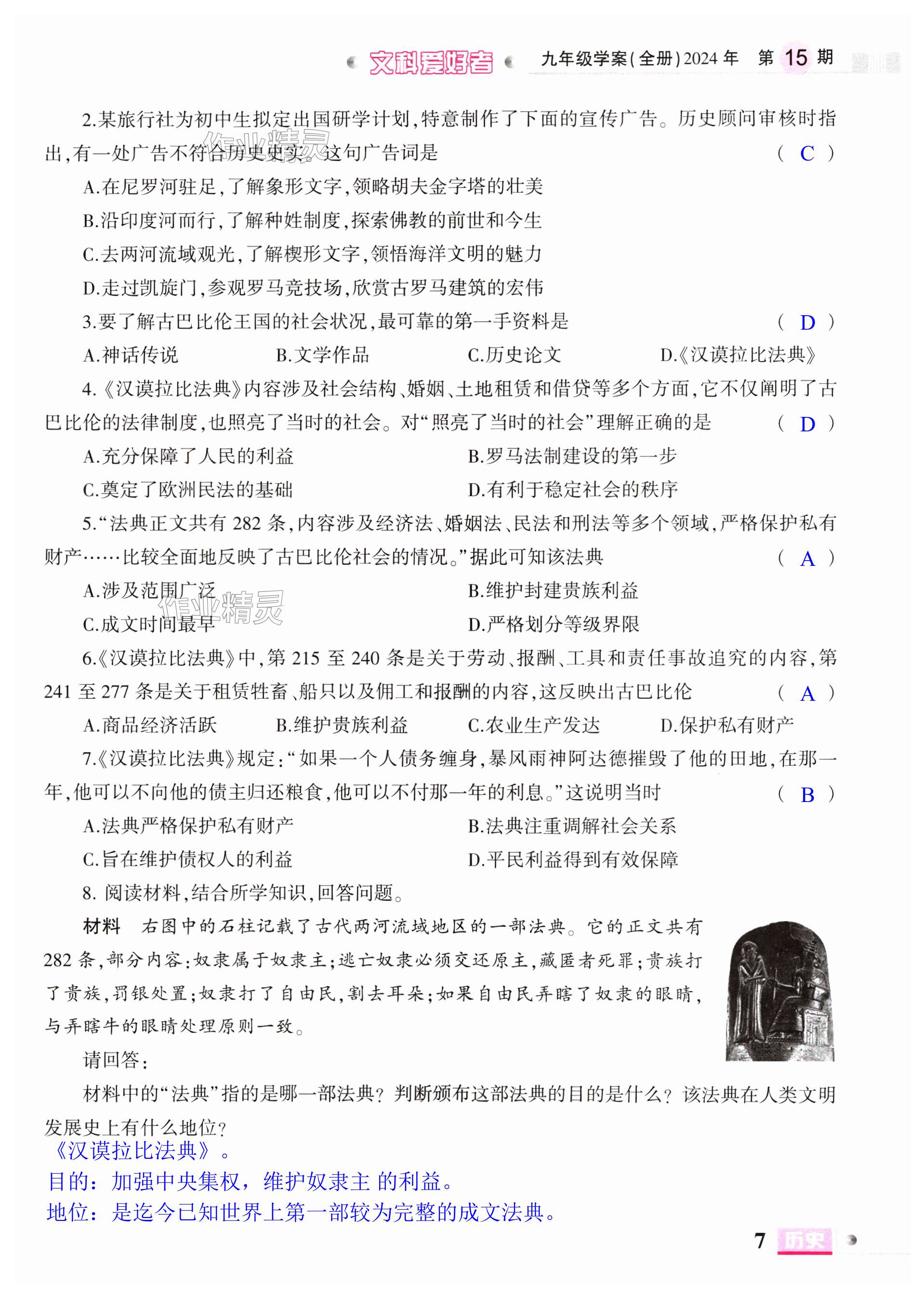 注:目前有些书本章节名称可能整理的还不是很完善,但都是按照顺序排列的,请同学们按照顺序仔细查找。练习册 2024年文科爱好者九年级历史全一册人教版第15期 答案主要是用来给同学们做完题方便对答案用的,请勿直接抄袭。
