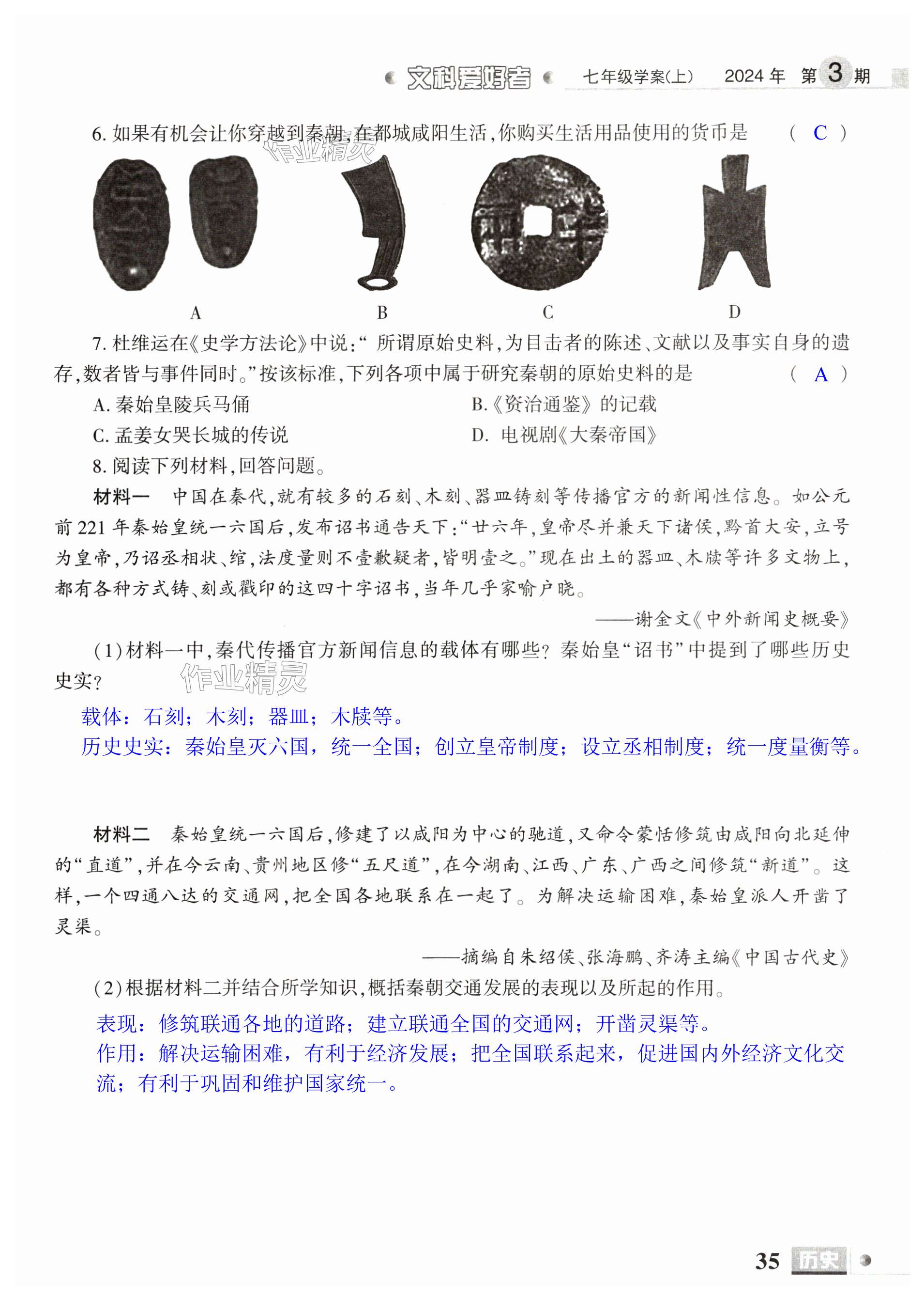 注:目前有些书本章节名称可能整理的还不是很完善,但都是按照顺序排列的,请同学们按照顺序仔细查找。练习册 2024年文科爱好者七年级历史上册人教版第3期 答案主要是用来给同学们做完题方便对答案用的,请勿直接抄袭。