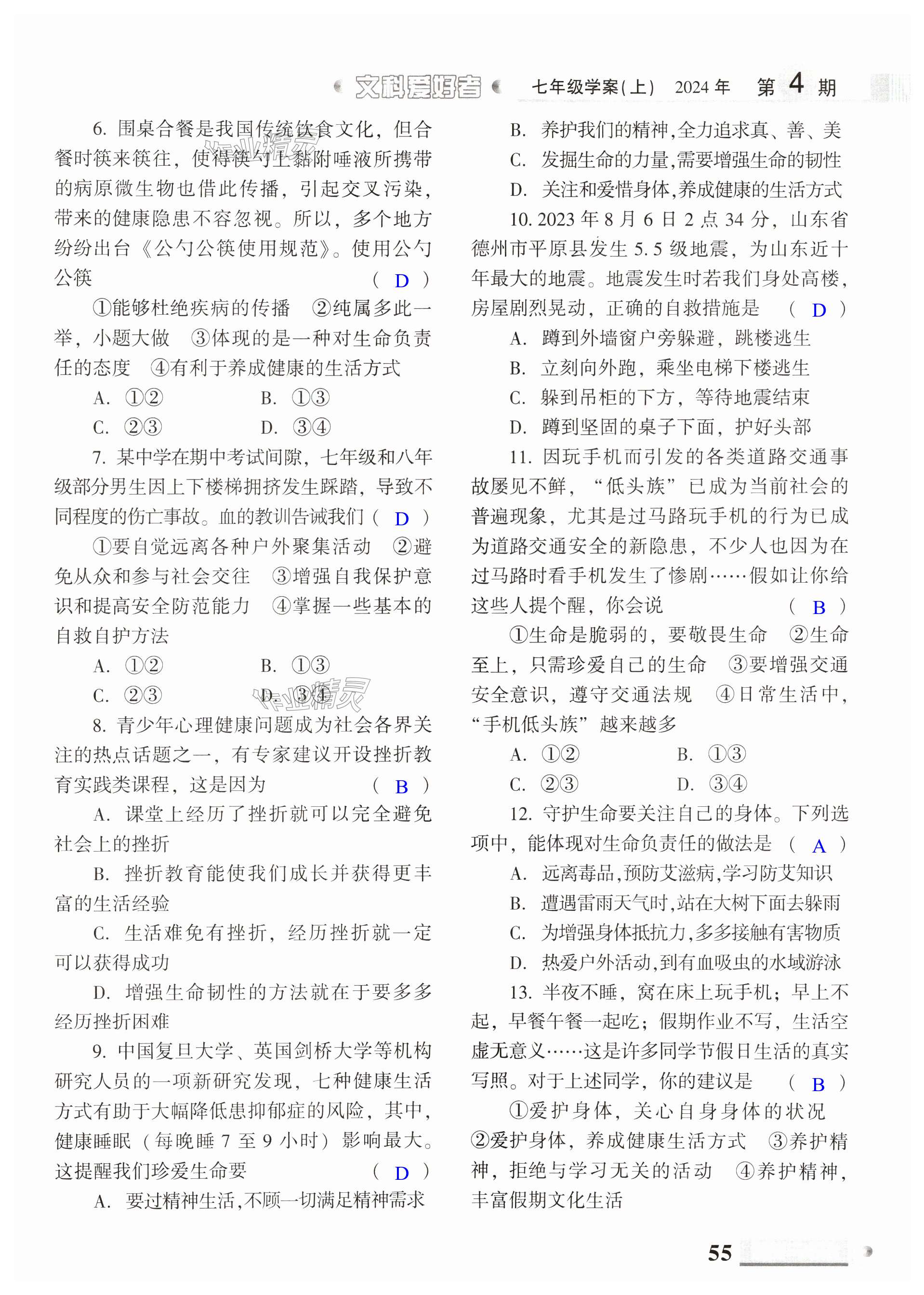 注:目前有些书本章节名称可能整理的还不是很完善,但都是按照顺序排列的,请同学们按照顺序仔细查找。练习册 2024年文科爱好者七年级道德与法治上册人教版第4期 答案主要是用来给同学们做完题方便对答案用的,请勿直接抄袭。