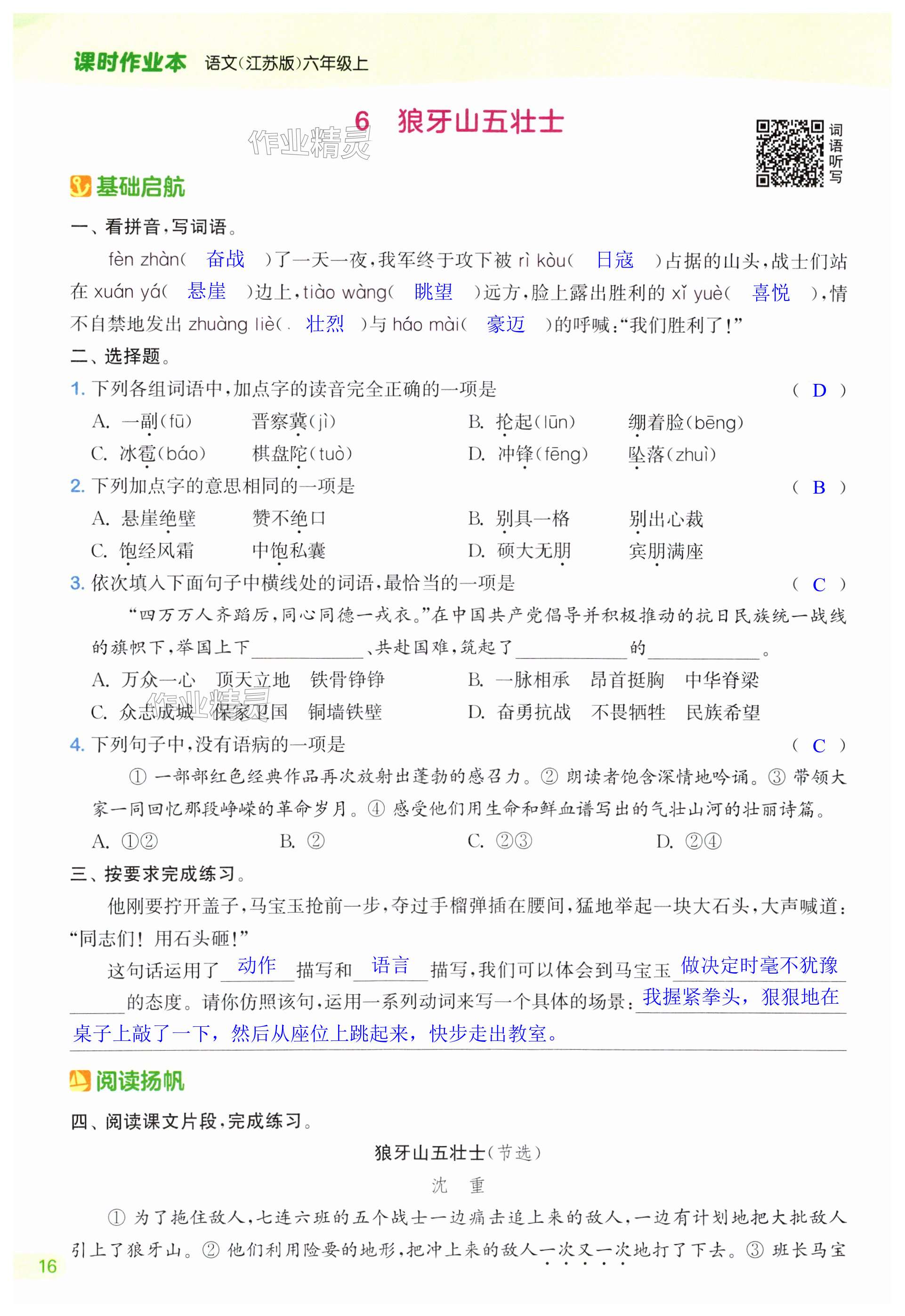 注:目前有些书本章节名称可能整理的还不是很完善,但都是按照顺序排列的,请同学们按照顺序仔细查找。练习册 2024年课时作业本闯关练六年级语文上册人教版江苏专版 答案主要是用来给同学们做完题方便对答案用的,请勿直接抄袭。