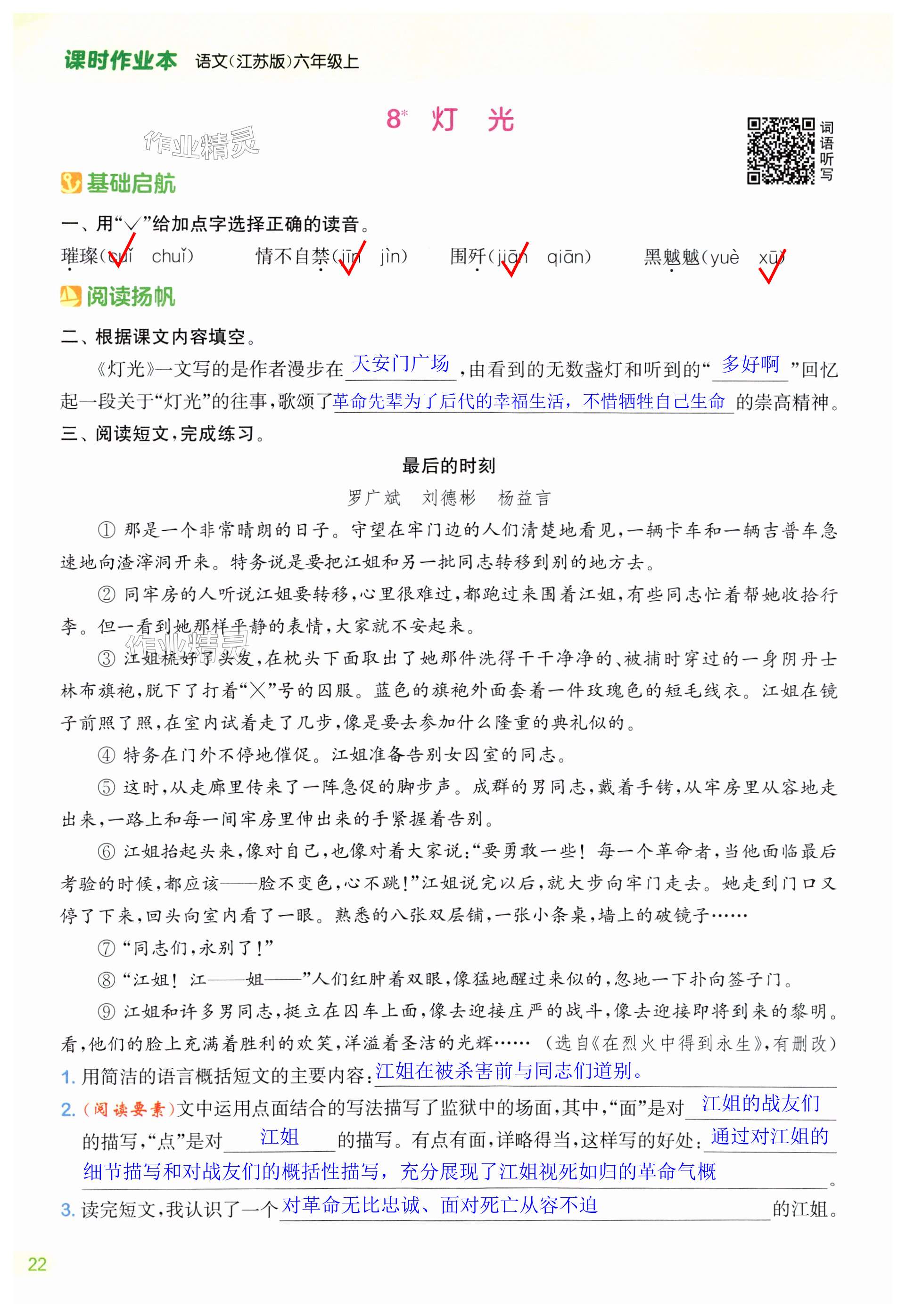 注:目前有些书本章节名称可能整理的还不是很完善,但都是按照顺序排列的,请同学们按照顺序仔细查找。练习册 2024年课时作业本闯关练六年级语文上册人教版江苏专版 答案主要是用来给同学们做完题方便对答案用的,请勿直接抄袭。