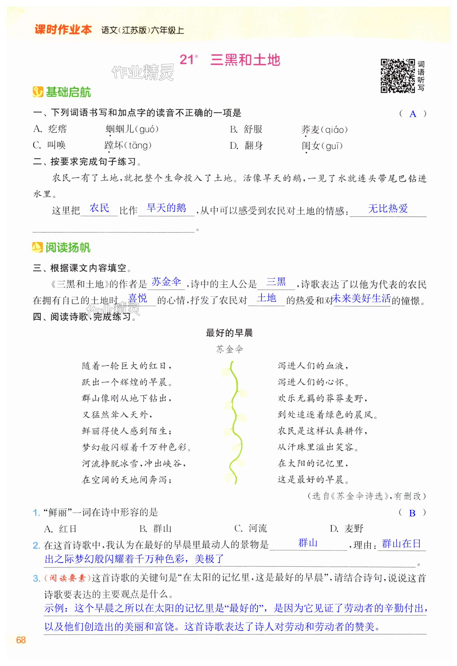 注:目前有些书本章节名称可能整理的还不是很完善,但都是按照顺序排列的,请同学们按照顺序仔细查找。练习册 2024年课时作业本闯关练六年级语文上册人教版江苏专版 答案主要是用来给同学们做完题方便对答案用的,请勿直接抄袭。