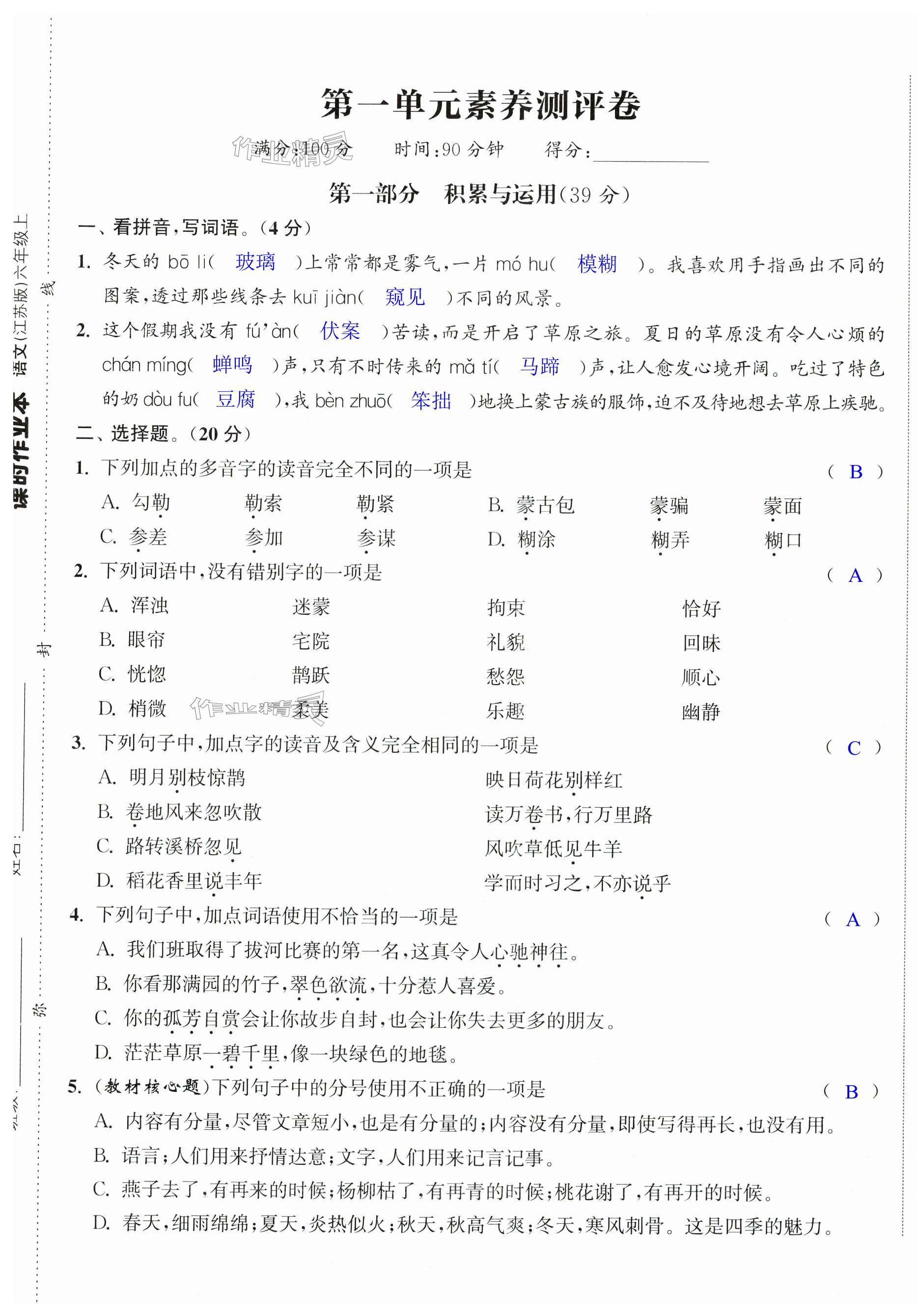 注:目前有些书本章节名称可能整理的还不是很完善,但都是按照顺序排列的,请同学们按照顺序仔细查找。练习册 2024年课时作业本闯关练六年级语文上册人教版江苏专版 答案主要是用来给同学们做完题方便对答案用的,请勿直接抄袭。
