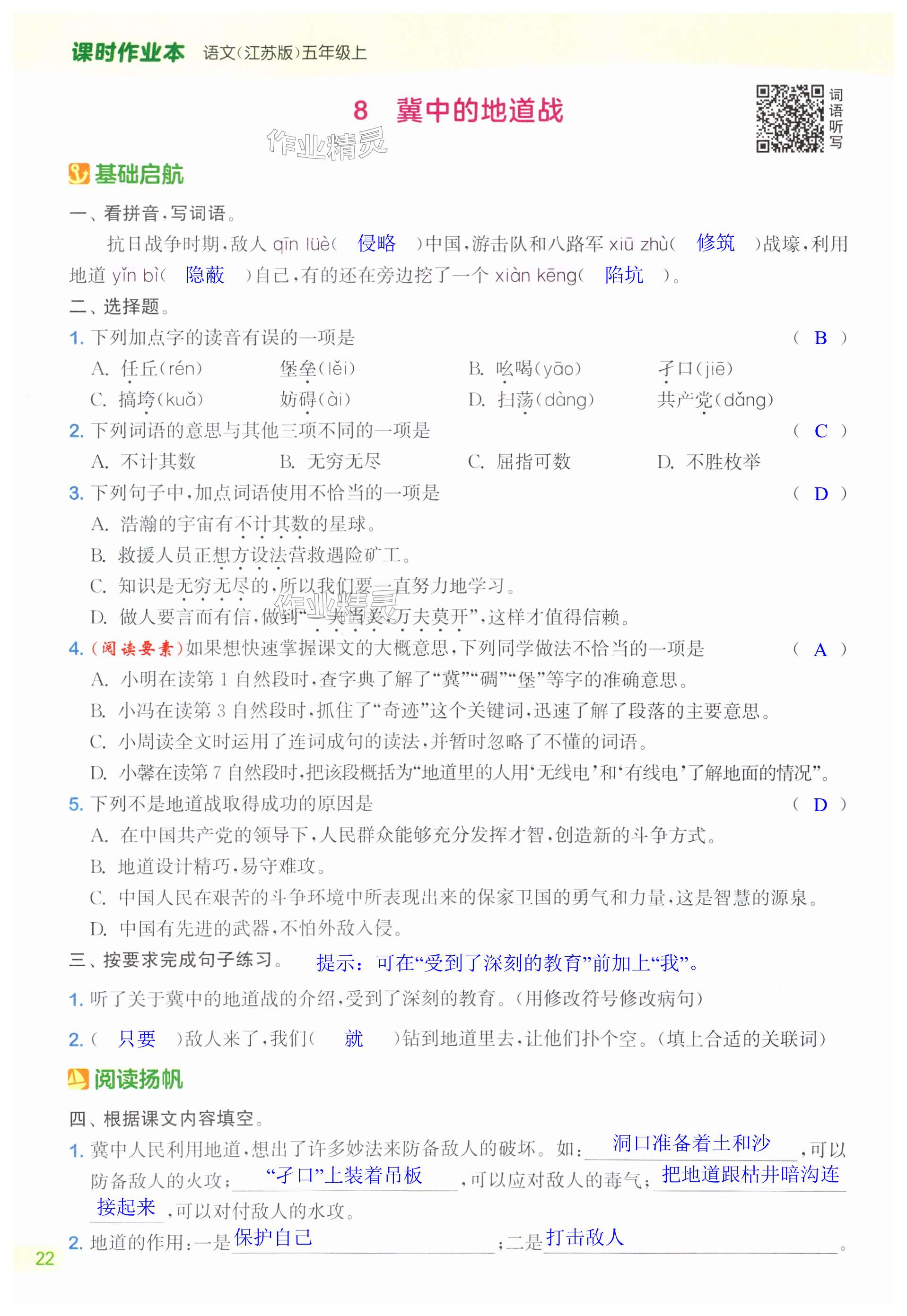 注:目前有些书本章节名称可能整理的还不是很完善,但都是按照顺序排列的,请同学们按照顺序仔细查找。练习册 2024年课时作业本闯关练五年级语文上册人教版江苏专版 答案主要是用来给同学们做完题方便对答案用的,请勿直接抄袭。