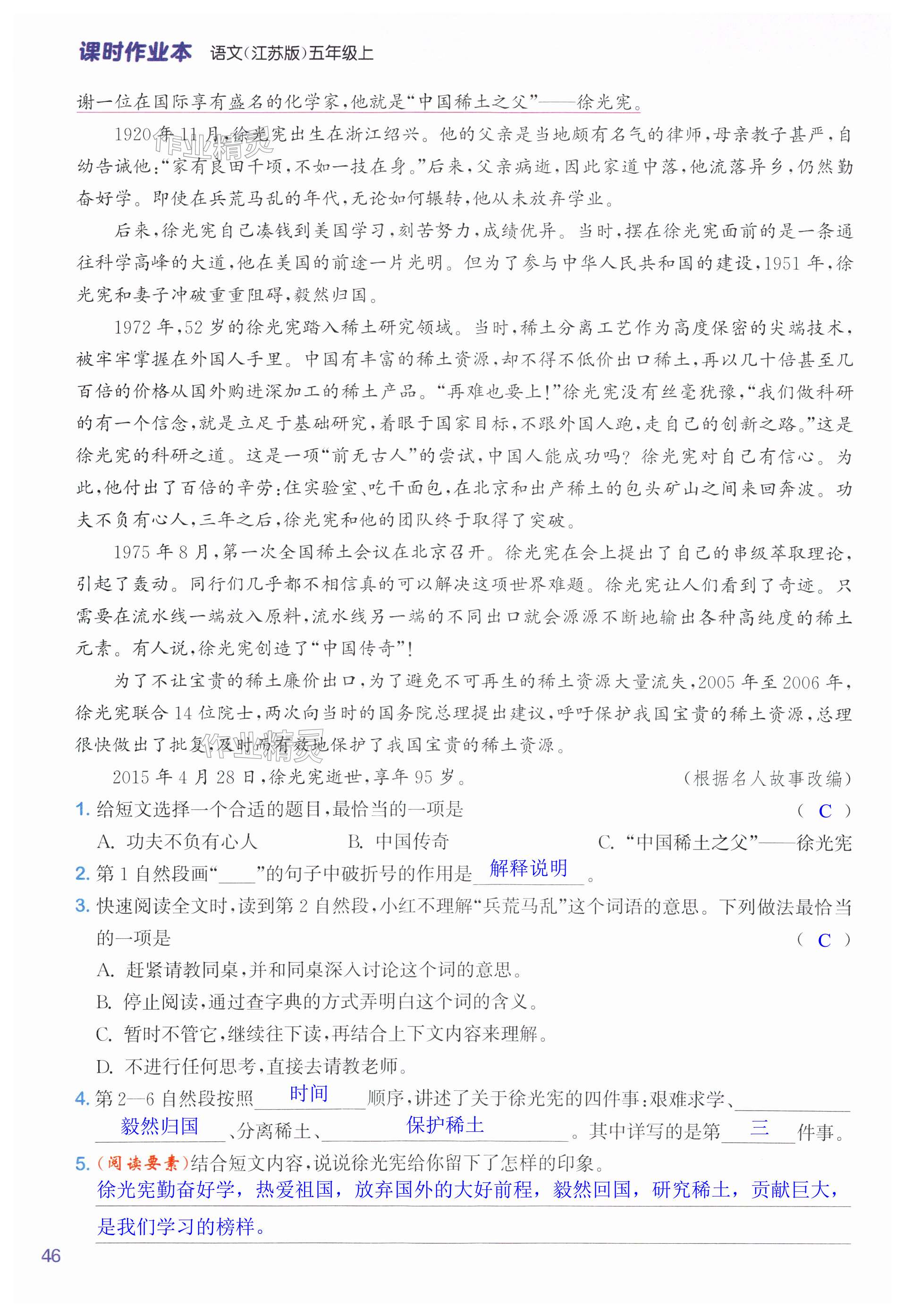注:目前有些书本章节名称可能整理的还不是很完善,但都是按照顺序排列的,请同学们按照顺序仔细查找。练习册 2024年课时作业本闯关练五年级语文上册人教版江苏专版 答案主要是用来给同学们做完题方便对答案用的,请勿直接抄袭。