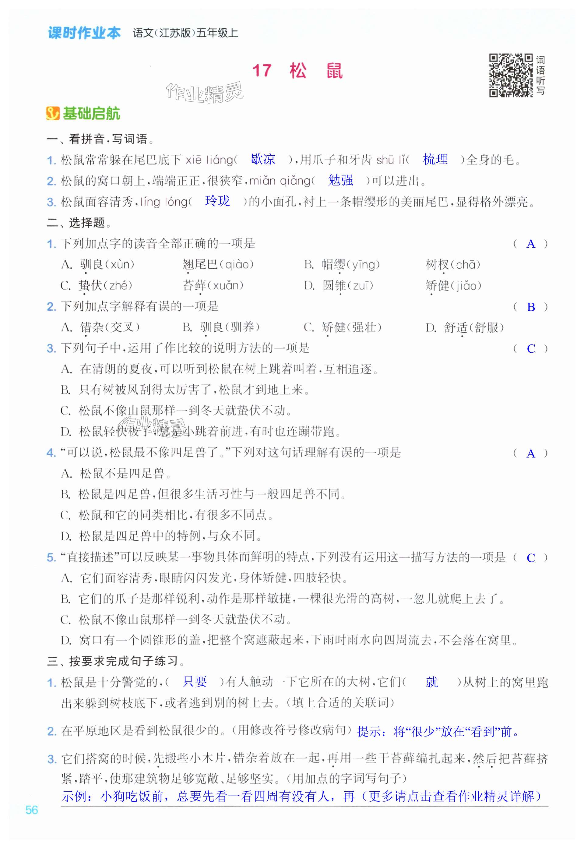 注:目前有些书本章节名称可能整理的还不是很完善,但都是按照顺序排列的,请同学们按照顺序仔细查找。练习册 2024年课时作业本闯关练五年级语文上册人教版江苏专版 答案主要是用来给同学们做完题方便对答案用的,请勿直接抄袭。