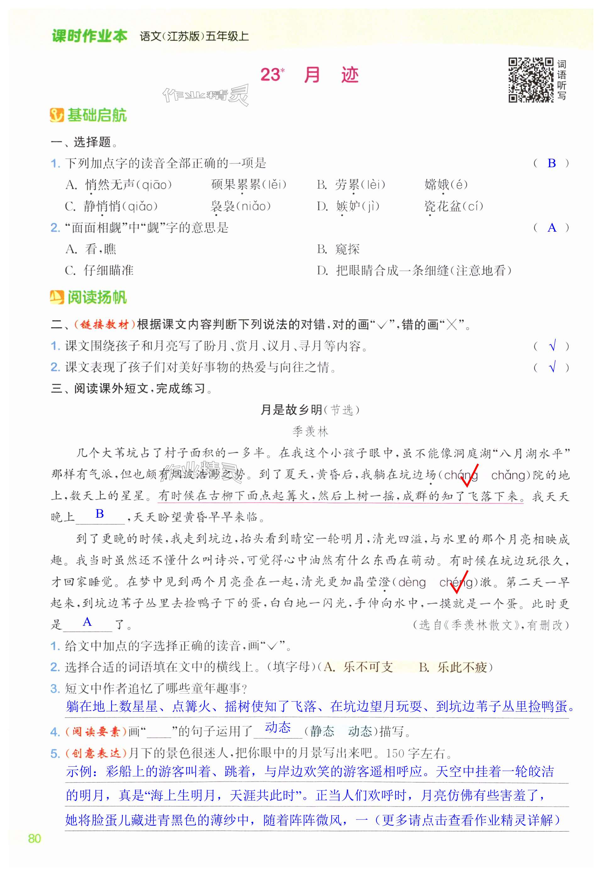 注:目前有些书本章节名称可能整理的还不是很完善,但都是按照顺序排列的,请同学们按照顺序仔细查找。练习册 2024年课时作业本闯关练五年级语文上册人教版江苏专版 答案主要是用来给同学们做完题方便对答案用的,请勿直接抄袭。