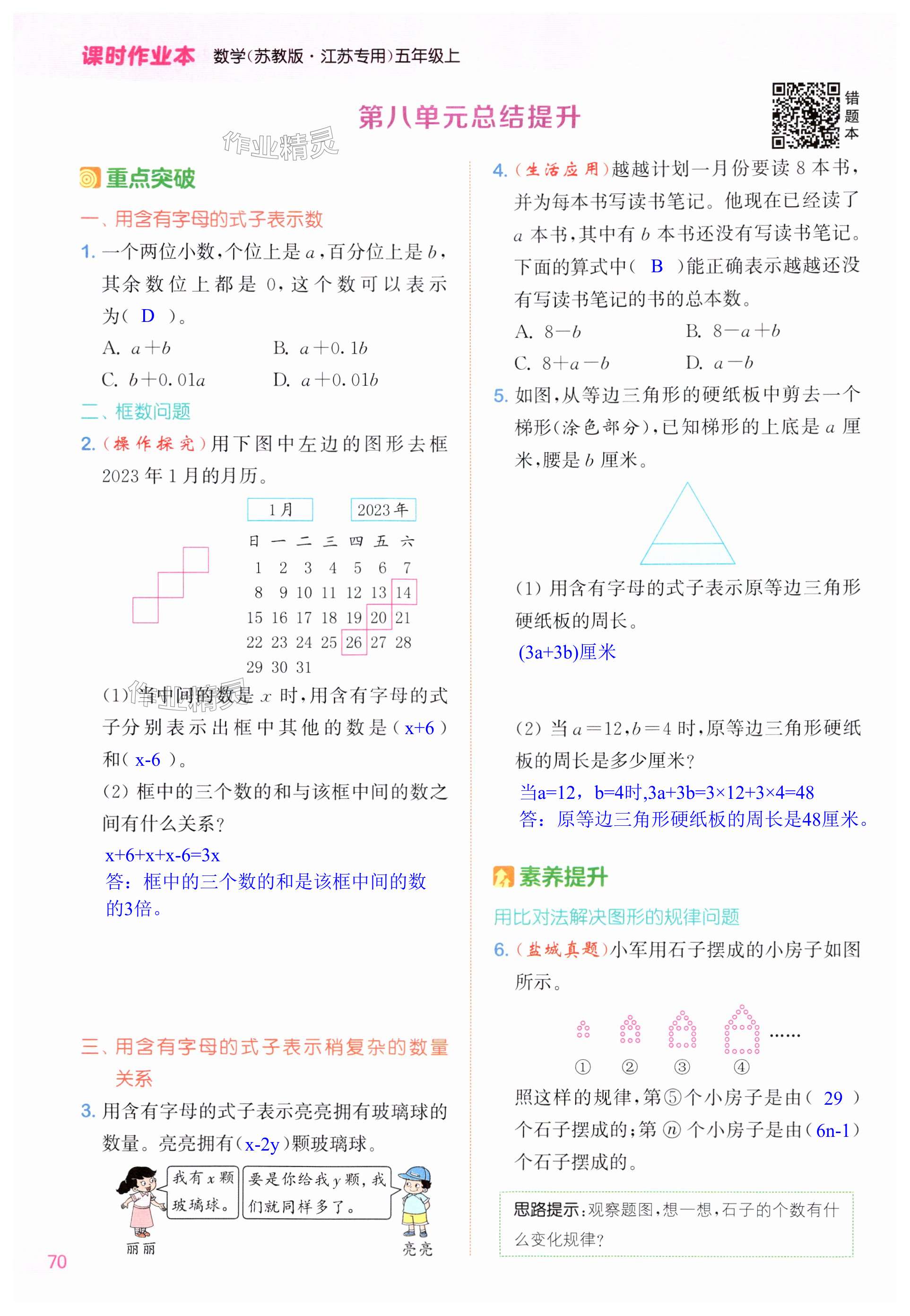 注:目前有些书本章节名称可能整理的还不是很完善,但都是按照顺序排列的,请同学们按照顺序仔细查找。练习册 2024年课时作业本闯关练五年级数学上册苏教版江苏专版 答案主要是用来给同学们做完题方便对答案用的,请勿直接抄袭。