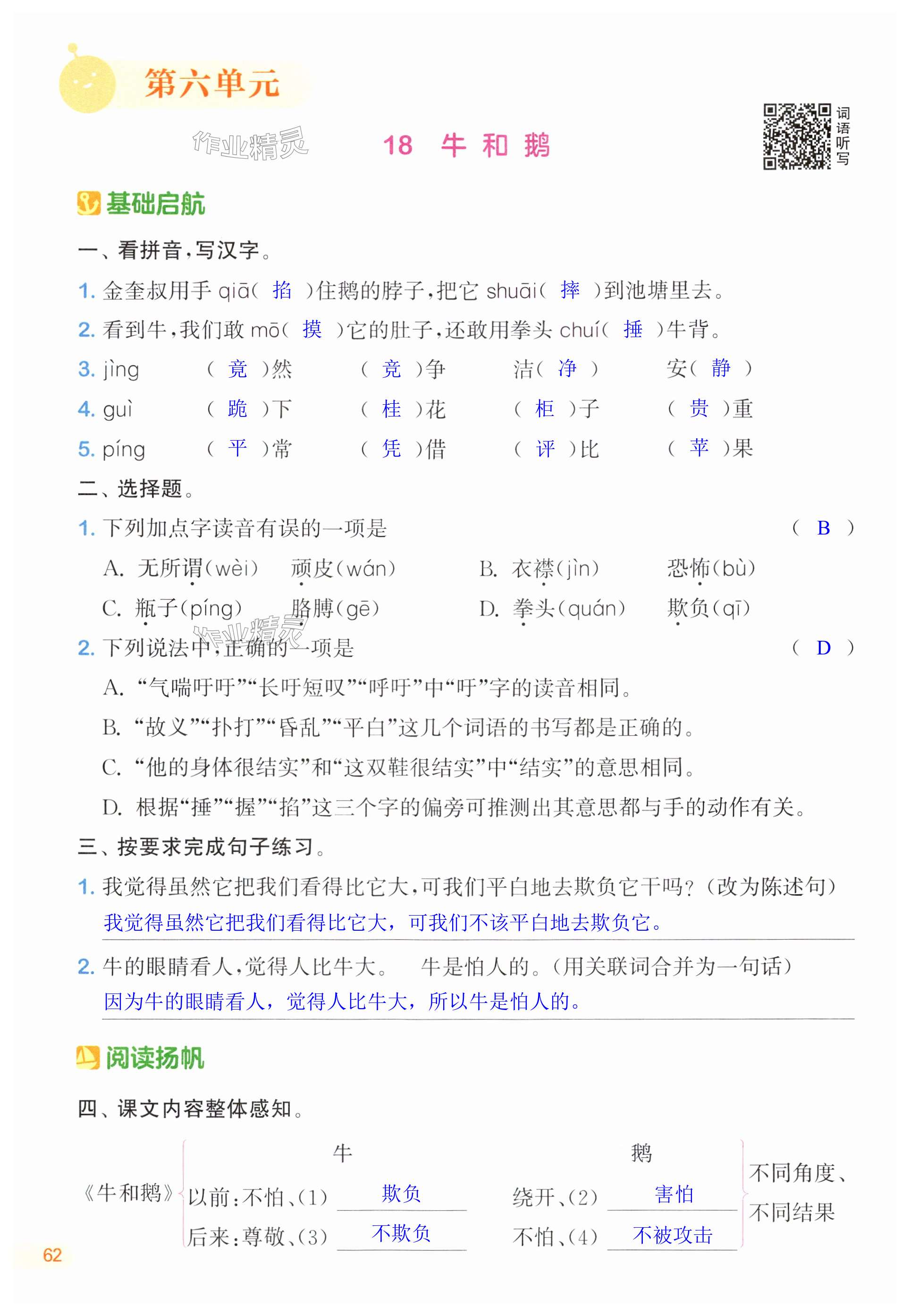 注:目前有些书本章节名称可能整理的还不是很完善,但都是按照顺序排列的,请同学们按照顺序仔细查找。练习册 2024年课时作业本闯关练四年级语文上册人教版江苏专版 答案主要是用来给同学们做完题方便对答案用的,请勿直接抄袭。