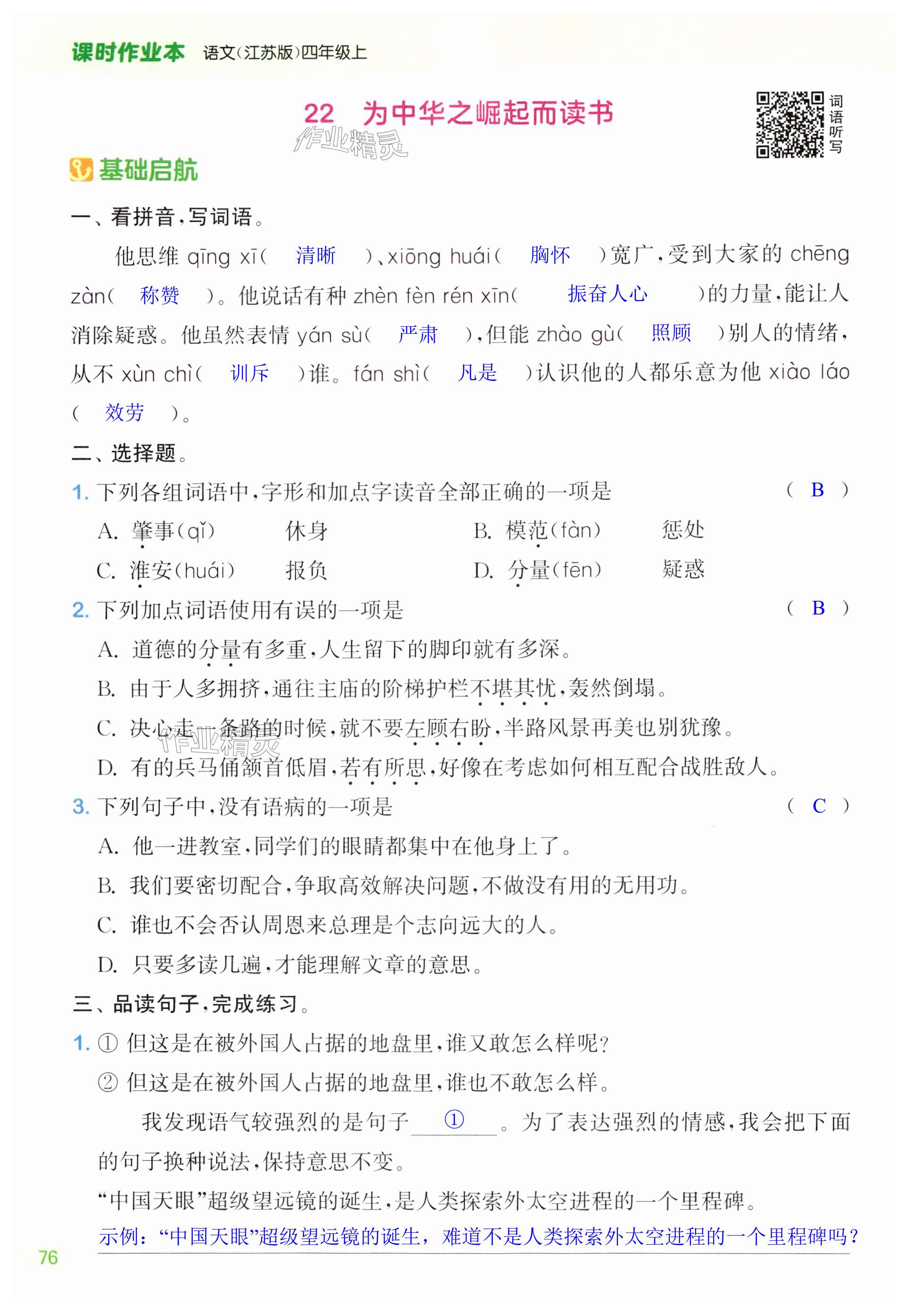 注:目前有些书本章节名称可能整理的还不是很完善,但都是按照顺序排列的,请同学们按照顺序仔细查找。练习册 2024年课时作业本闯关练四年级语文上册人教版江苏专版 答案主要是用来给同学们做完题方便对答案用的,请勿直接抄袭。