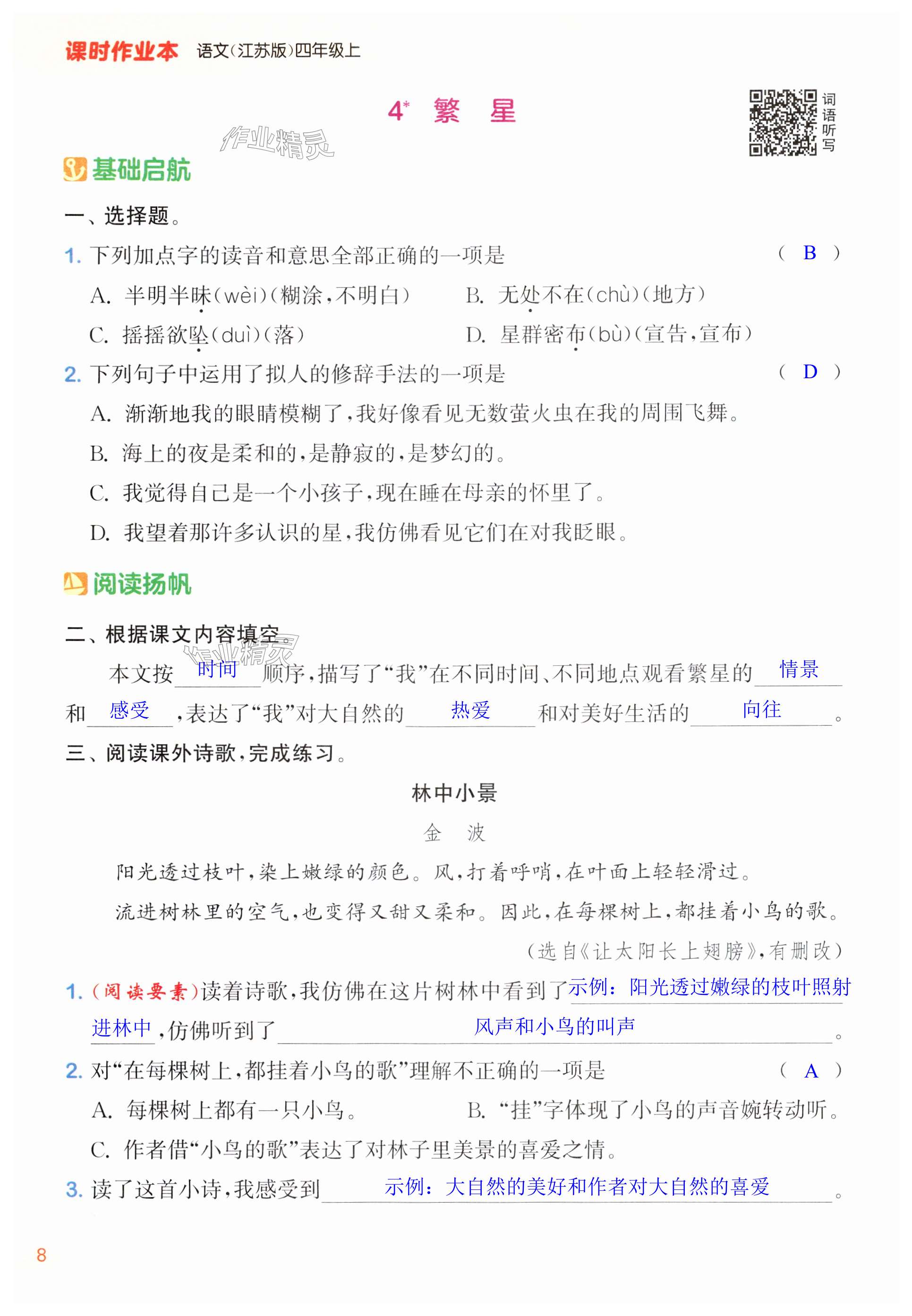 注:目前有些书本章节名称可能整理的还不是很完善,但都是按照顺序排列的,请同学们按照顺序仔细查找。练习册 2024年课时作业本闯关练四年级语文上册人教版江苏专版 答案主要是用来给同学们做完题方便对答案用的,请勿直接抄袭。