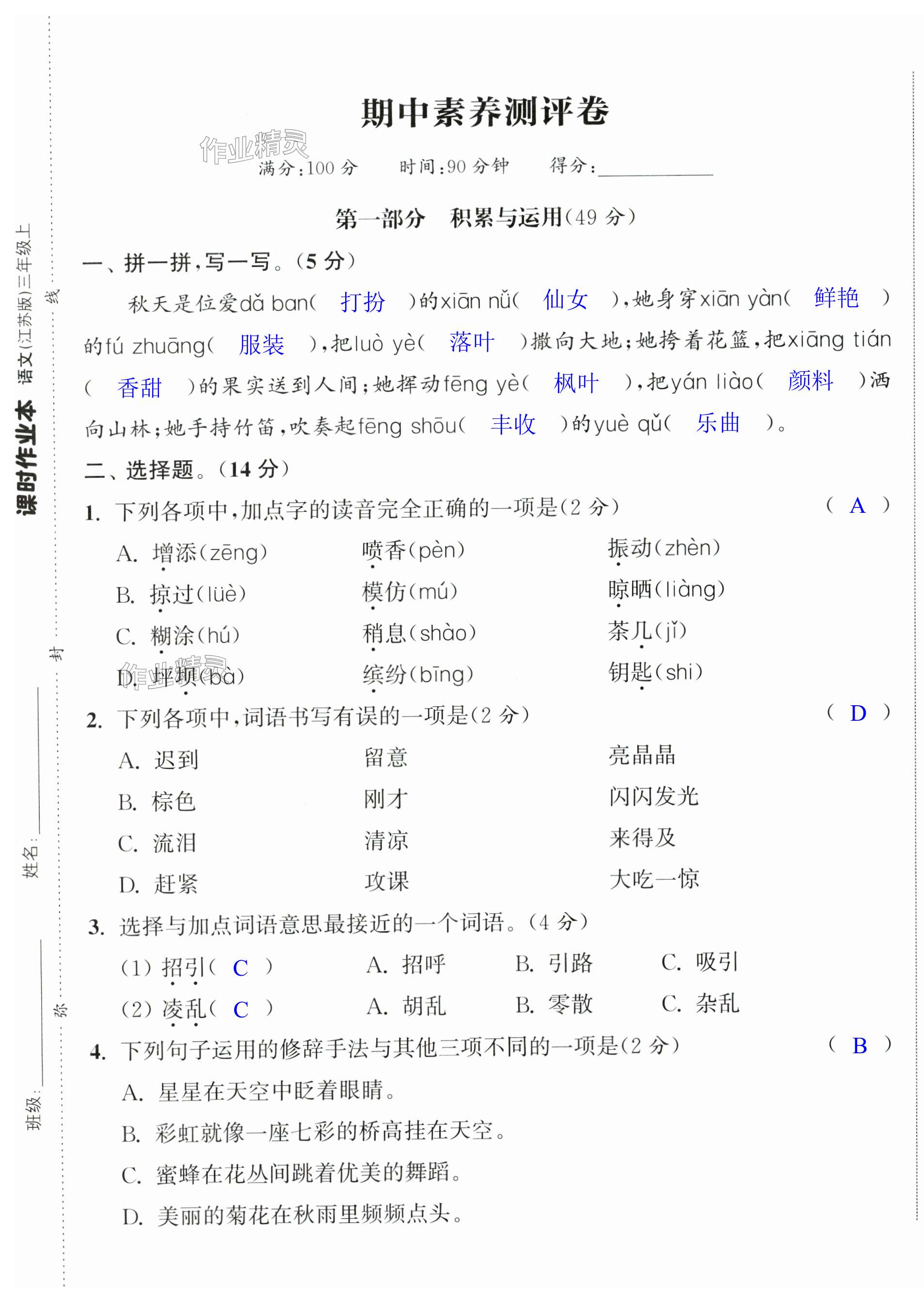 注:目前有些书本章节名称可能整理的还不是很完善,但都是按照顺序排列的,请同学们按照顺序仔细查找。练习册 2024年课时作业本闯关练三年级语文上册人教版江苏专版 答案主要是用来给同学们做完题方便对答案用的,请勿直接抄袭。