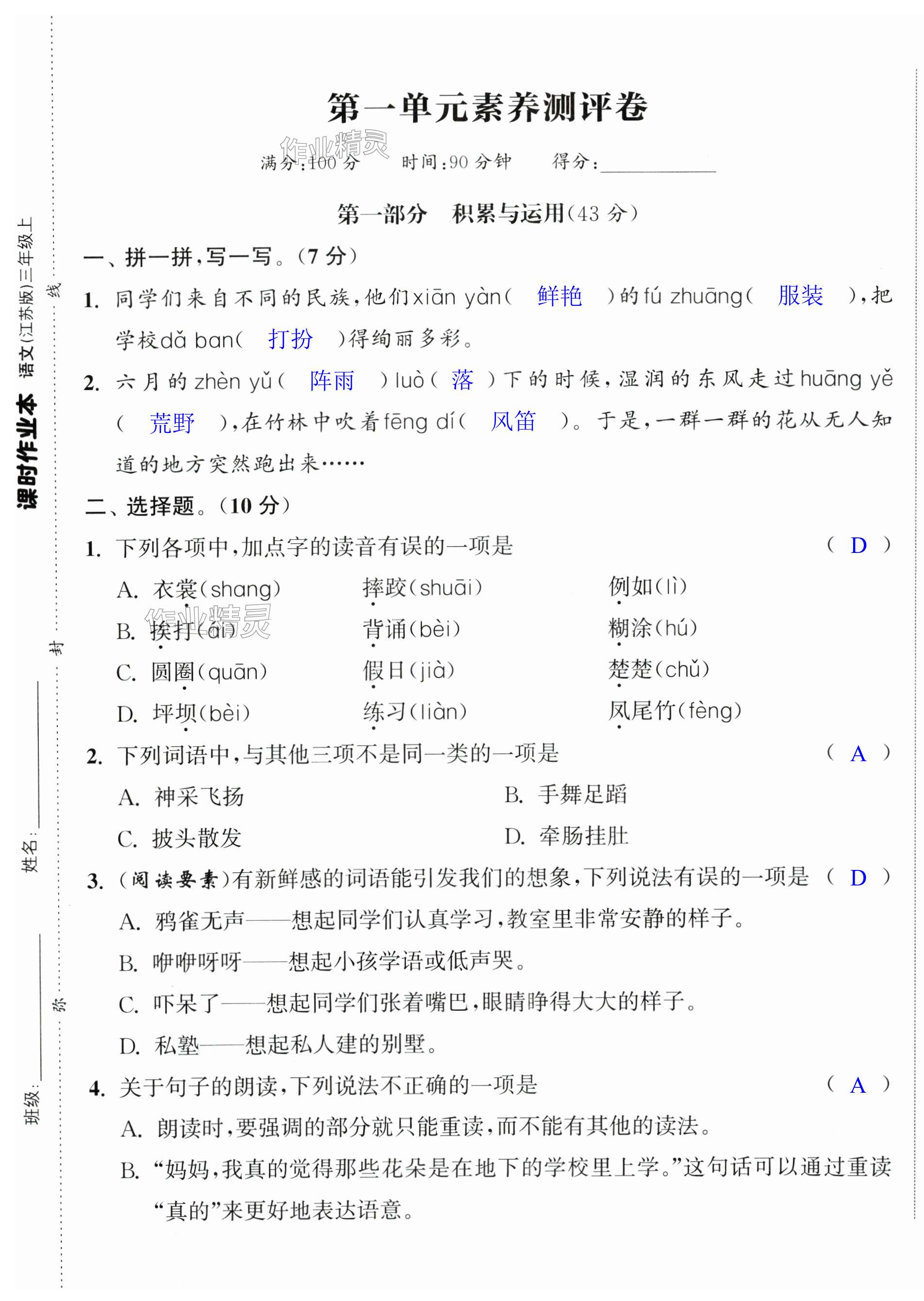 注:目前有些书本章节名称可能整理的还不是很完善,但都是按照顺序排列的,请同学们按照顺序仔细查找。练习册 2024年课时作业本闯关练三年级语文上册人教版江苏专版 答案主要是用来给同学们做完题方便对答案用的,请勿直接抄袭。