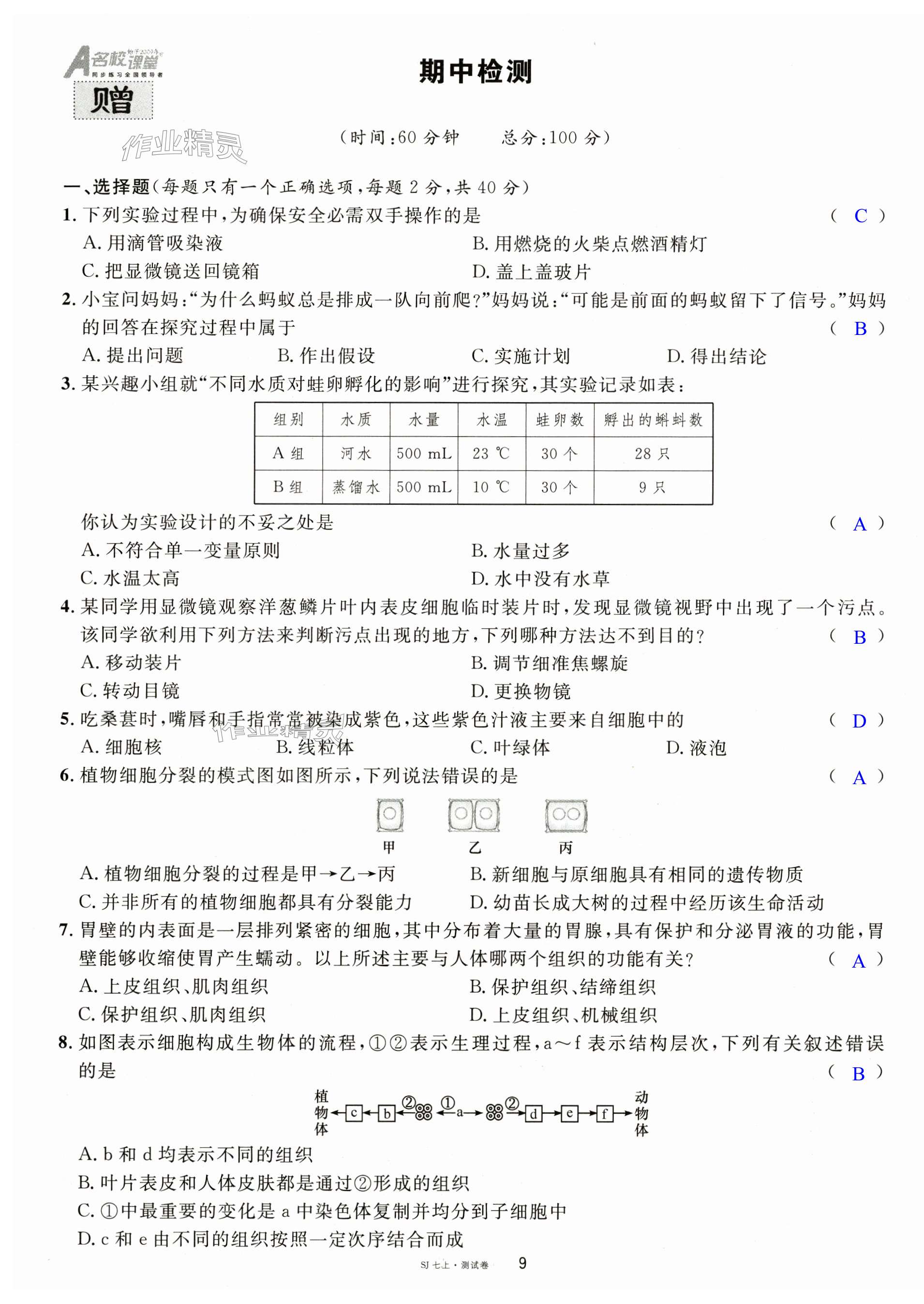 注:目前有些书本章节名称可能整理的还不是很完善,但都是按照顺序排列的,请同学们按照顺序仔细查找。练习册 2024年名校课堂七年级生物上册苏教版 答案主要是用来给同学们做完题方便对答案用的,请勿直接抄袭。