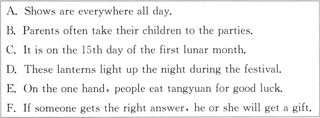 People celebrate the festival in many ways. The lantern show is the most important part of the festival. On the night of the festival, many lanterns are hung in the streets and parks. 2. ________ People often go out and watch the lantern show with their family and friends.