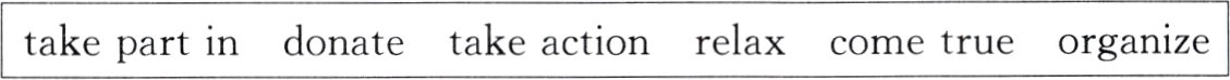 二、1. to organize 2. to take action 3. to take part in 4. donation 5. come true
