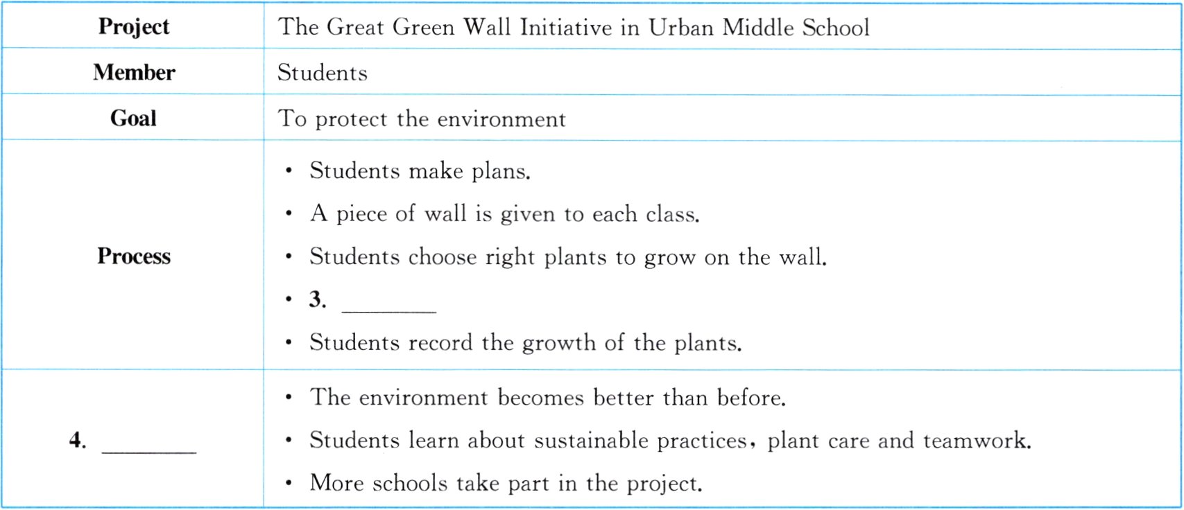 The project in Urban Middle School teaches students about sustainable(可持续的) practices, plant care and teamwork. In the project, students make plans. A piece of wall is given to each class. Then students choose right plants to grow on the wall. They take turns to take care of the plants. They also record the growth of the plants.