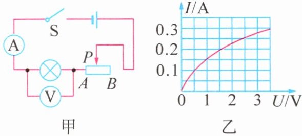 B 解析:由图乙可知,小灯泡两端的电压为2.5 V时,电流为0.25 A,则小灯泡的额定功率$P_{L}=U_{L}I_{L}=2.5\ V×0.25\ A = 0.625\ W$,故A正确;电路的总功率约为0.64 W时,电路中的电流$I=\frac{P}{U}=\frac{0.64\ W}{4\ V}=0.16\ A$,由图乙可知,此时小灯泡两端的电压约为1 V,滑动变阻器两端的电压$U_{P}=U - U_{L}'=4\ V - 1\ V = 3\ V$,由欧姆定律可得,滑动变阻器接入电路的阻值$R_{P}=\frac{U_{P}}{I}=\frac{3\ V}{0.16\ A}=18.75\ \Omega$,故B错误;当小灯泡正常工作时,滑动变阻器两端的电压$U_{滑}=U - U_{L}=4\ V - 2.5\ V = 1.5\ V$,串联电路各处的电流相等,由$P = UI$可知,此时小灯泡和滑动变阻器的功率之比为$P_{L}:P_{滑}=U_{L}:U_{滑}=2.5\ V:1.5\ V = 5:3$,故C正确;探究导体的电流与电压的关系时,要控制电阻大小不变,而小灯泡的电阻随温度的变化而变化,不是一个定值,所以,利用图甲电路不能探究导体的电流与电压的关系,故D正确。