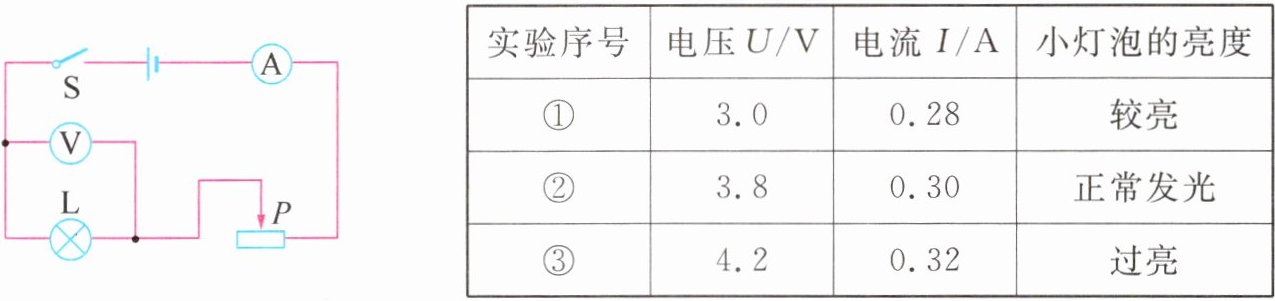 7. (2024·江苏无锡)用如图所示的电路测量小灯泡的功率,实验原理是: . 闭合开关,调节滑动变阻器滑片 P,分别使电压表的示数小于、等于和略大于小灯泡的额定电压 3.8 V,观察小灯泡的亮度,读出电压表、电流表的示数记录在下表中. 则小灯泡 L 的额定功率为 W,小灯泡的亮度由 决定.