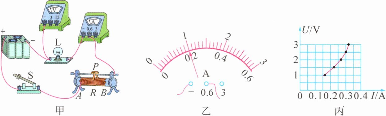 (3)继续移动滑片 P,让电压表示数低于 2.5 V,某时刻电流表示数如图乙为 A,观察小灯泡亮度并记录电表示数. 继续缓慢移动滑片 P,让电压表示数略大于 2.5 V,观察小灯泡亮度并记录电表示数. 小明根据所有实验数据作出了小灯泡的 U - I 图像,如图丙,则小灯泡的额定功率为 W.