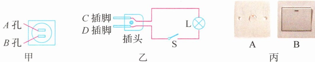 3.(2024·福建厦门模拟)如图甲所示是小刚家的一个插座,小刚用测电笔接触插座A孔,氖管发光,乙图是一个台灯的电路示意图,当把台灯接入电路时,为了安全,应将台灯插头的________(选填“C”或“D”)插脚插入A孔. 丙图是两种墙壁开关,其按钮可绕面板内转动,根据你的生活经验,________(选填“A”或“B”)型较易损坏.