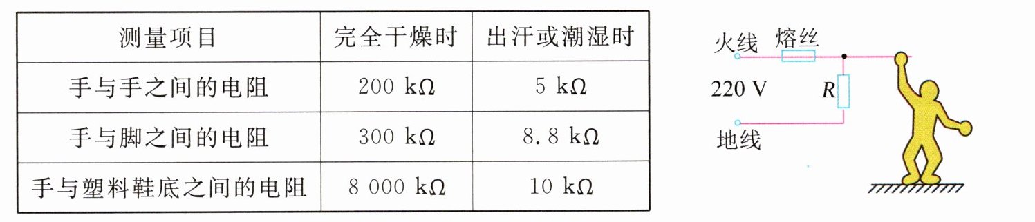 10. 现代家庭电气化程度越来越高,用电安全是一个十分突出的问题. 如表提供了一组人体电阻数据. 如图所示,用电器R 接在电压为220 V 的电源上时,消耗电功率是1 100 W,电路中还有额定电流为10 A 的熔丝. 则: