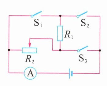 - (3)闭合$S_{1}$、$S_{3}$,断开$S_{2}$时,$R_{1}$和$R_{2}$并联,电流表测干路电流。$R_{2}$规格为“$30\Omega$ 1A”,则$R_{2}$支路的电流最大为1A,$R_{1}$支路的电流为0.6A,则干路电流最大为$I_{大}=1A + 0.6A = 1.6A$,则电路的最大电功率$P_{大}=UI_{大}=6V×1.6A = 9.6W$。