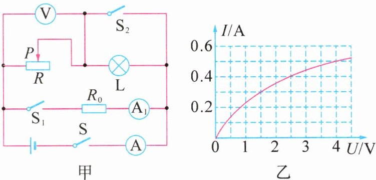 5. (2024·重庆三模)如图甲所示的电路,电源电压不变,L 是标有“4 V”字样的灯泡,定值电阻$R_0$的阻值为 90 Ω,变阻器 R 标有“? Ω 1 A”字样,两个电流表的量程均为 0~0.6 A,电压表的量程为 0~15 V,图乙是通过 L 的电流随其电压变化的图像. 当 S 闭合,$S_1$、$S_2$断开,且 R 连入电路阻值为总阻值的$\frac{1}{4}$时,L 恰好正常发光,电压表示数为 5 V. 继续滑动滑片,下列计算正确的是 ( )