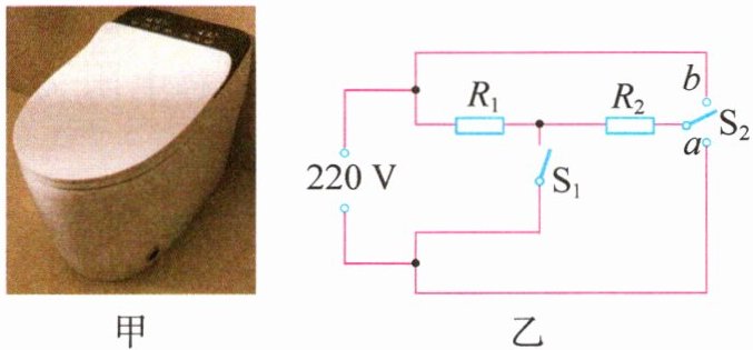 5. 如图甲为家用智能电热马桶盖,图乙是其电路原理图,$R_1$和$R_2$是两个定值电阻(表示两个电热丝),单刀双掷开关$S_2$可接$a$或$b$,该电路通过开关$S_1$和$S_2$的不同接法组合,实现“高温挡、中温挡、低温挡”三种加热功能。当开关$S_1$断开、$S_2$接$a$时,电路的功率为$44\ W$;开关$S_1$闭合、$S_2$接$a$时,电路的功率为$88\ W$。求: