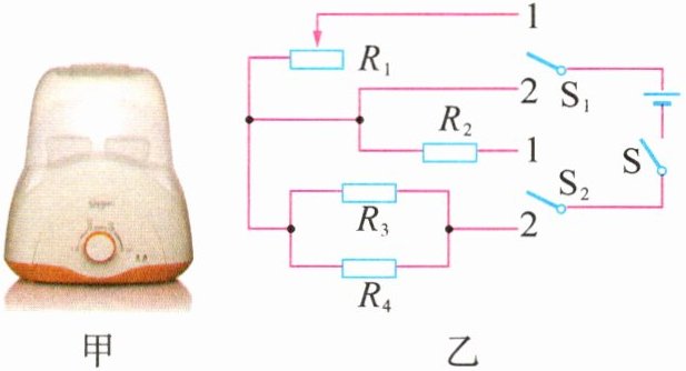 A@@解析:由图乙可知,$S$闭合,$S_{1}$、$S_{2}$均接1时,滑动变阻器$R_{1}$和定值电阻$R_{2}$串联,总电阻最大,由$P=\frac{U^{2}}{R}$可知,总功率最小,暖奶器处于低温挡,可通过变阻器$R_{1}$调节保温功率;$S$闭合,$S_{1}$、$S_{2}$均接2时,$R_{3}$和$R_{4}$并联,总电阻最小,总功率最大,暖奶器处于高温挡,有定挡消毒功能;$S$闭合,$S_{1}$接2、$S_{2}$接1时,只有电阻$R_{2}$工作,电阻较大,暖奶器处于中温挡。