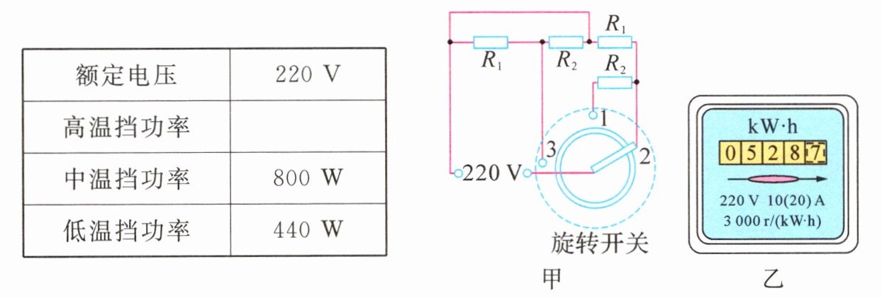 6. (2024·山东东营一模)随着生活质量的提升,各类空气炸锅、电烤箱、烧烤炉走进了千家万户,小明家新买了一个三挡位的电烤箱,电烤箱的相关参数如表所示,小明研究电烤箱加热板部分,画出了其简化电路如图甲所示,$R_1$、$R_2$是定值电阻,可通过旋转开关实现高、中、低挡位切换。则: