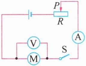 7. (2024·山东济宁一模)如图所示,电源电压恒为$10\ V$,滑动变阻器$R$的最大阻值为$20\ \Omega$,直流电动机$M$的额定电压为$6\ V$,线圈电阻为$2\ \Omega$。当闭合开关$S$,滑片$P$移到中点时,电动机刚好正常工作,电动机主要将电能转化为_______,此时电路中的电流为_______$A$,整个电路通电$100\ s$产生的热量为_______$J$。