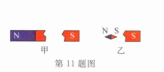 11. 如图甲,一条形磁体被摔断成两段,取右边的一段靠近小磁针,若小磁针静止时的指向如图乙,则图乙中裂纹端的磁极是________极. 若把这两段磁体沿裂纹吻合放在一起(如图甲),则这两段磁体会相互________(选填“吸引”或“排斥”).