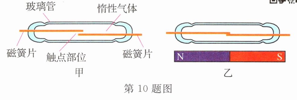 10. 亮点原创 门磁传感器是智能家居常见的传感器,常用于探测门、窗是否被非法打开. 门磁传感器的核心元件是干簧管,干簧管是一种磁控开关,其结构如图甲所示,其中磁簧片被固定于玻璃管内. 将一条形磁体靠近并与干簧管平行放置时,触点就会闭合,电路接通,如图乙所示;当条形磁体远离干簧管时,触点就会断开. 由此可知,磁簧片应是一种有弹性、易被________的软铁材料,干簧管的磁簧片触点部位闭合的原因是________名磁极相互________.