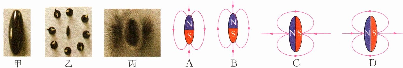7. 新素养 科学思维 (2024·江苏泰州期末)小冬想研究橄榄形磁体(如图甲)周围的磁场分布情况,做了如图所示的实验,其中图乙是小磁针(黑色为 N 极)静止时的指向,图丙是铁屑静止时的分布. 下列图中能正确用磁感线描述该磁体周围磁场分布的是 ( )