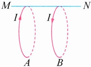 9. 通电线圈相当于一匝的通电螺线管,其两端的磁场与线圈中的电流方向的关系也符合安培定则. 把两个通电线圈 A 和 B 挂在水平光滑的固定绝缘细杆 MN 上,通有如图所示的电流,会发现通电线圈 A 和 B 将 ____________ (选填“相互靠近”“距离不变”或“相互远离”).