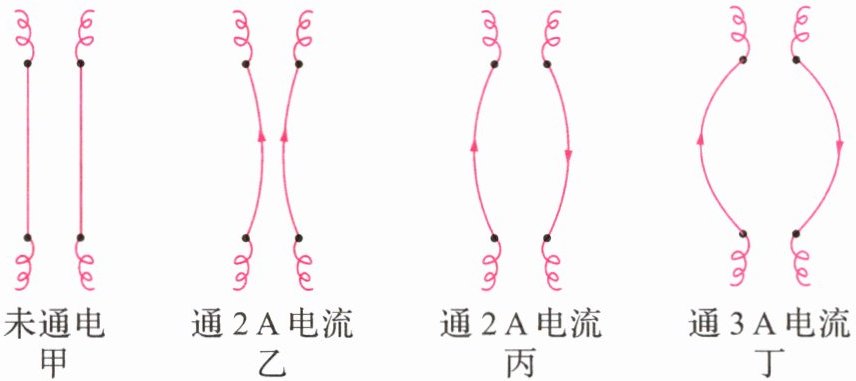 吸引@@排斥@@电流大小@@丙、丁两图中电流方向情况相同,电流大小不同,导线形变的程度不一样,说明力的大小不一样