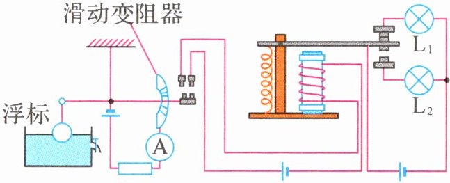 1.(2024·天津模拟)如图是汽车油箱内监测油量的装置模型,电流表显示油量,电磁继电器控制指示灯$L_1$、$L_2$。当油量减少时 ( )