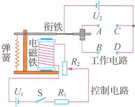 3.(2024·陕西渭南模拟)如图,小朱尝试用电磁继电器设计一个应急灯电路(以一个灯为例),要求外部电路停电时,图中的灯立即亮,则$C$点应该和触点________(选填“$A$”或“$B$”)相连,图中的电磁继电器相当于一个________(选填“开关”或“电源”).